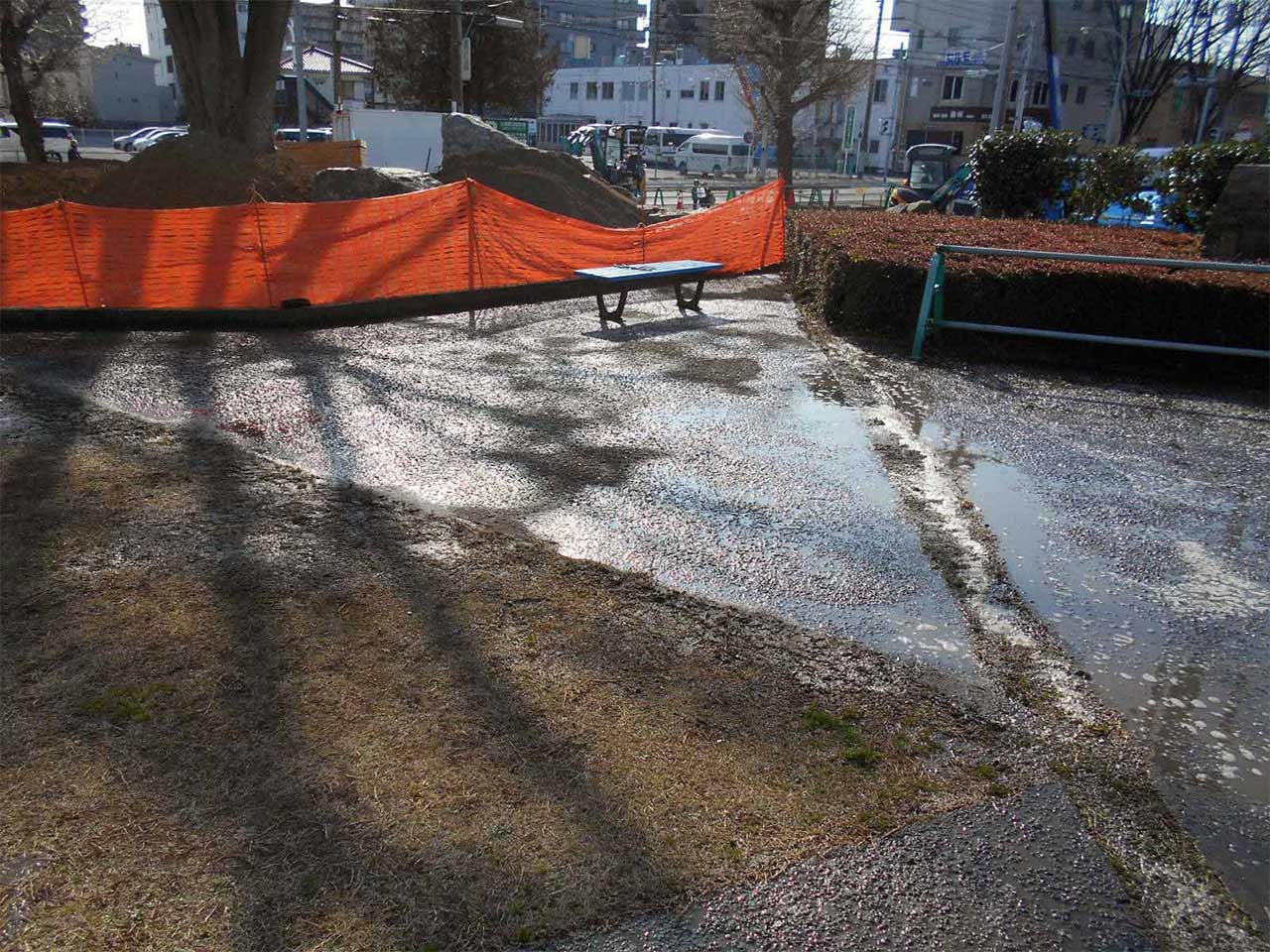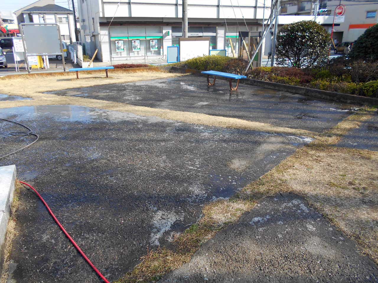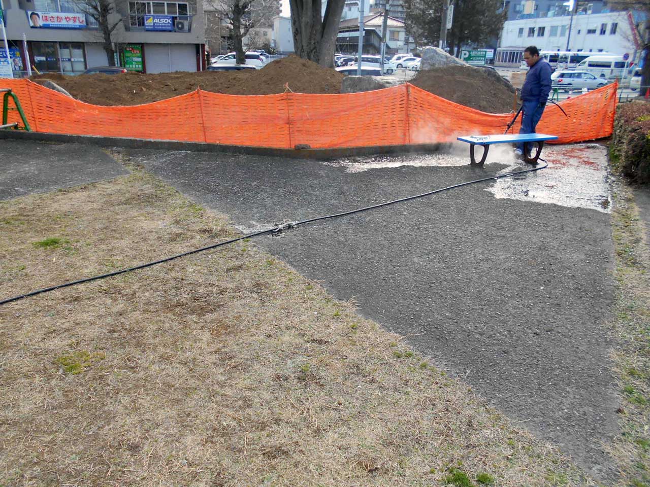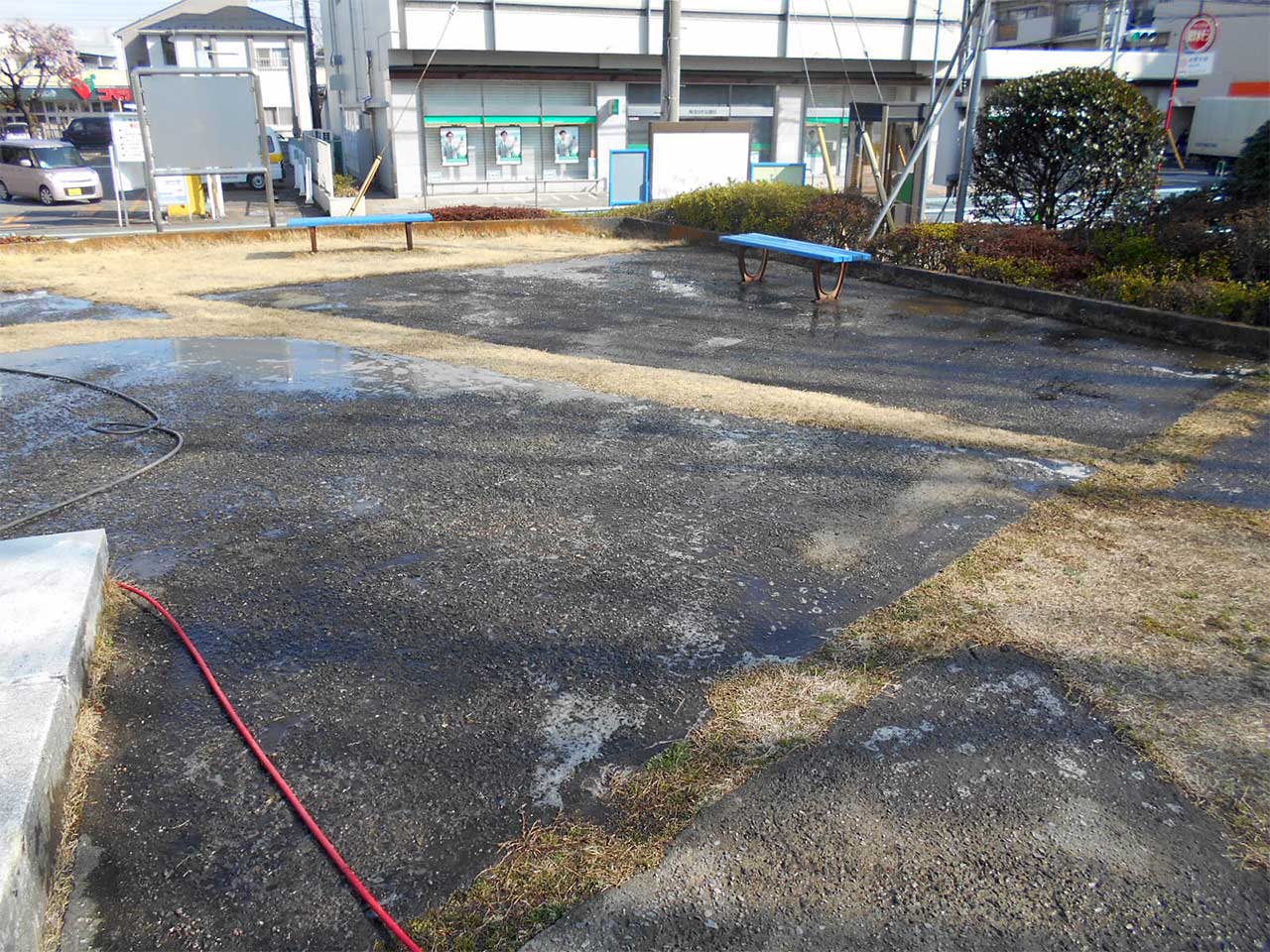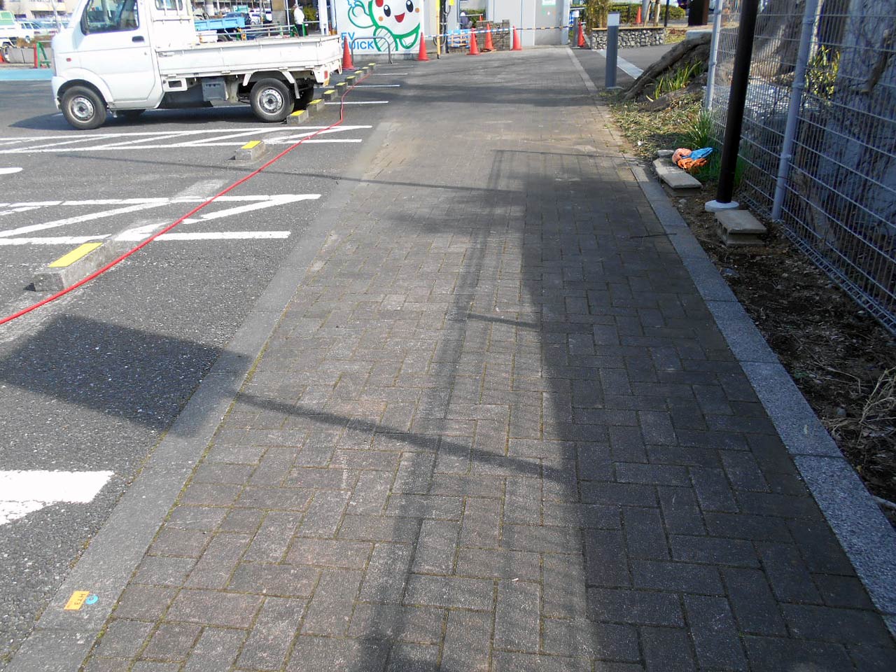 写真は竣工より約12年間、清掃未実施のインターロッキングブロック他、舗装道路等の最近の洗浄実例です。